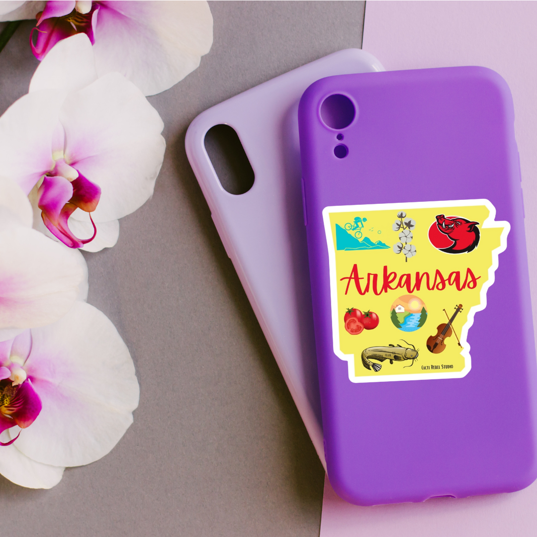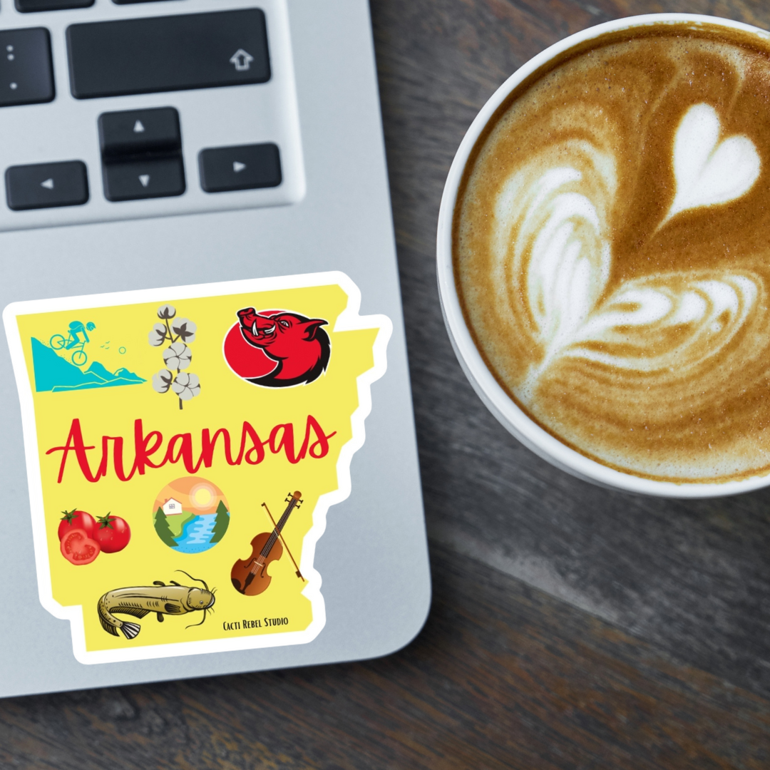 The state of Arkansas in sticker form, with all sorts of things from the state.