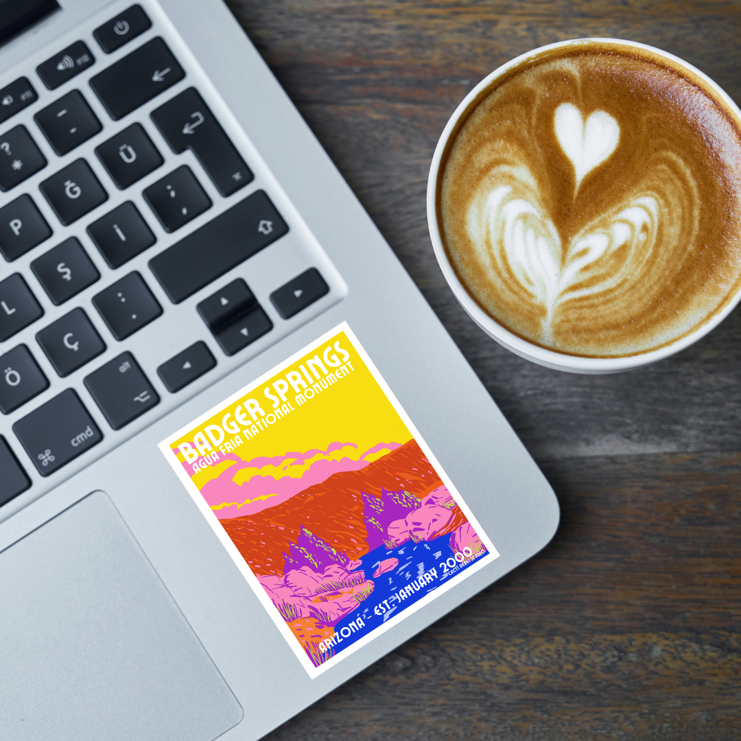 "Badger Springs at Agua Fria National Monument" is a fun sticker with a hand drawn with a view from with in the national monument. This is perfect if you are a national park lover or if you are making your way to visit all the national parks.