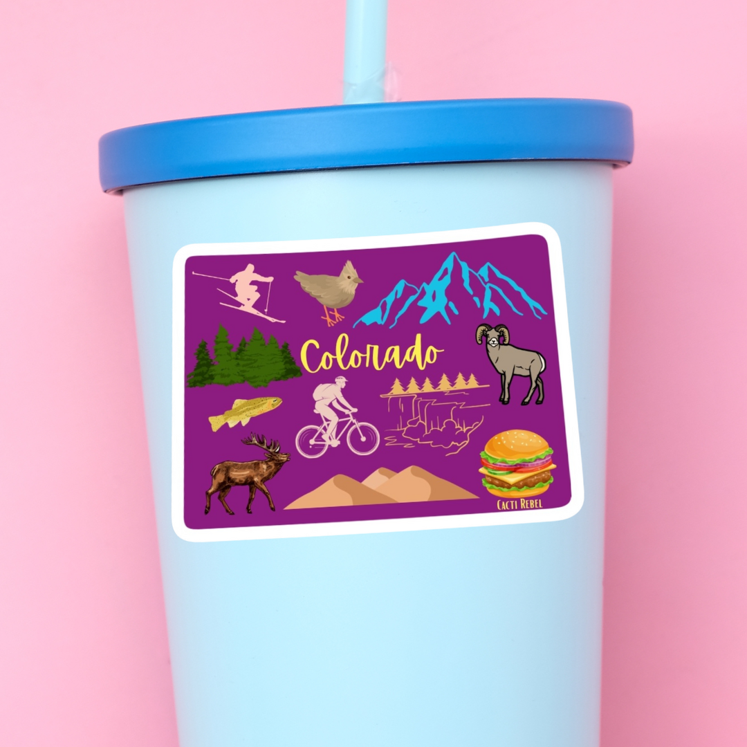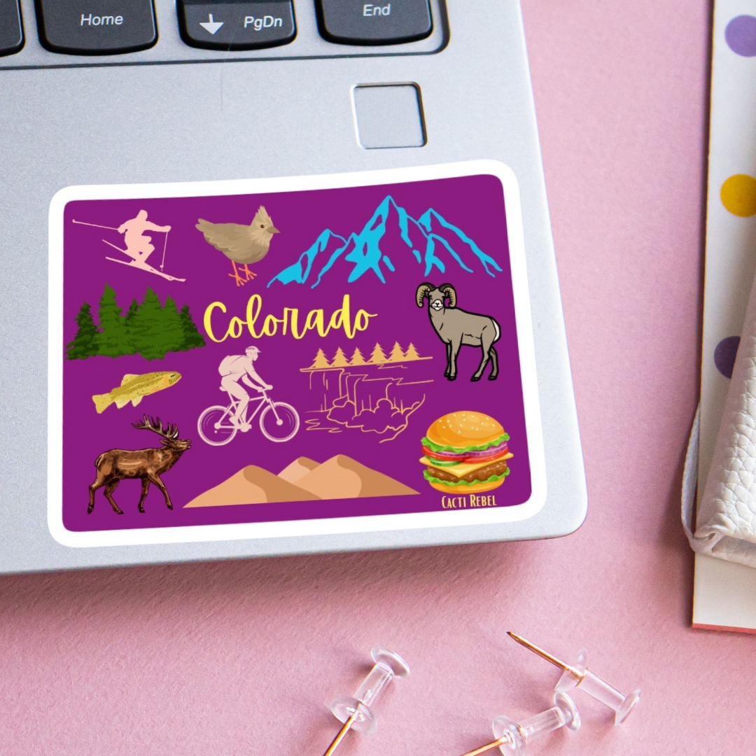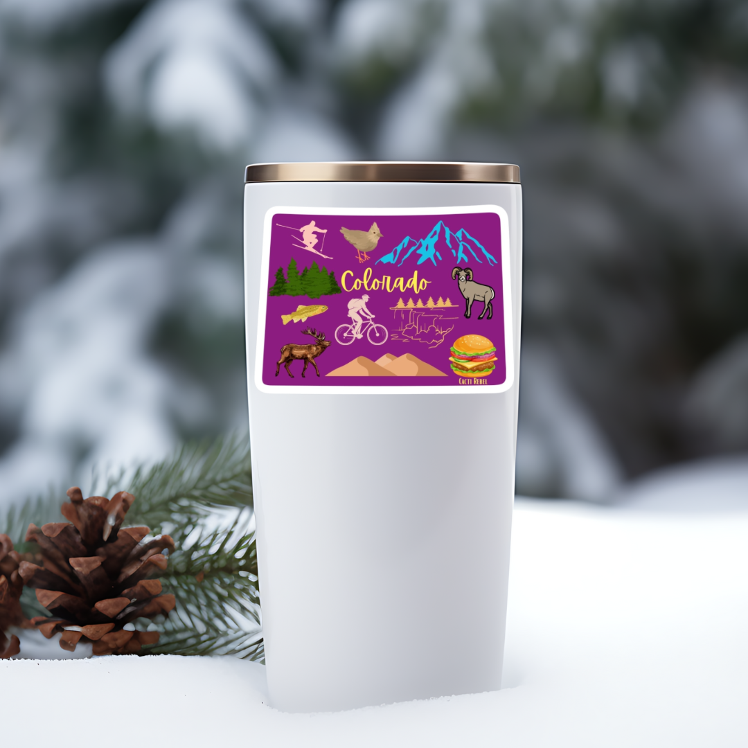 Colorado has mountains, skiing, mountain biking, all sorts of wildlife, scenery and more. This sticker shows off some of what makes Colorado so unique.