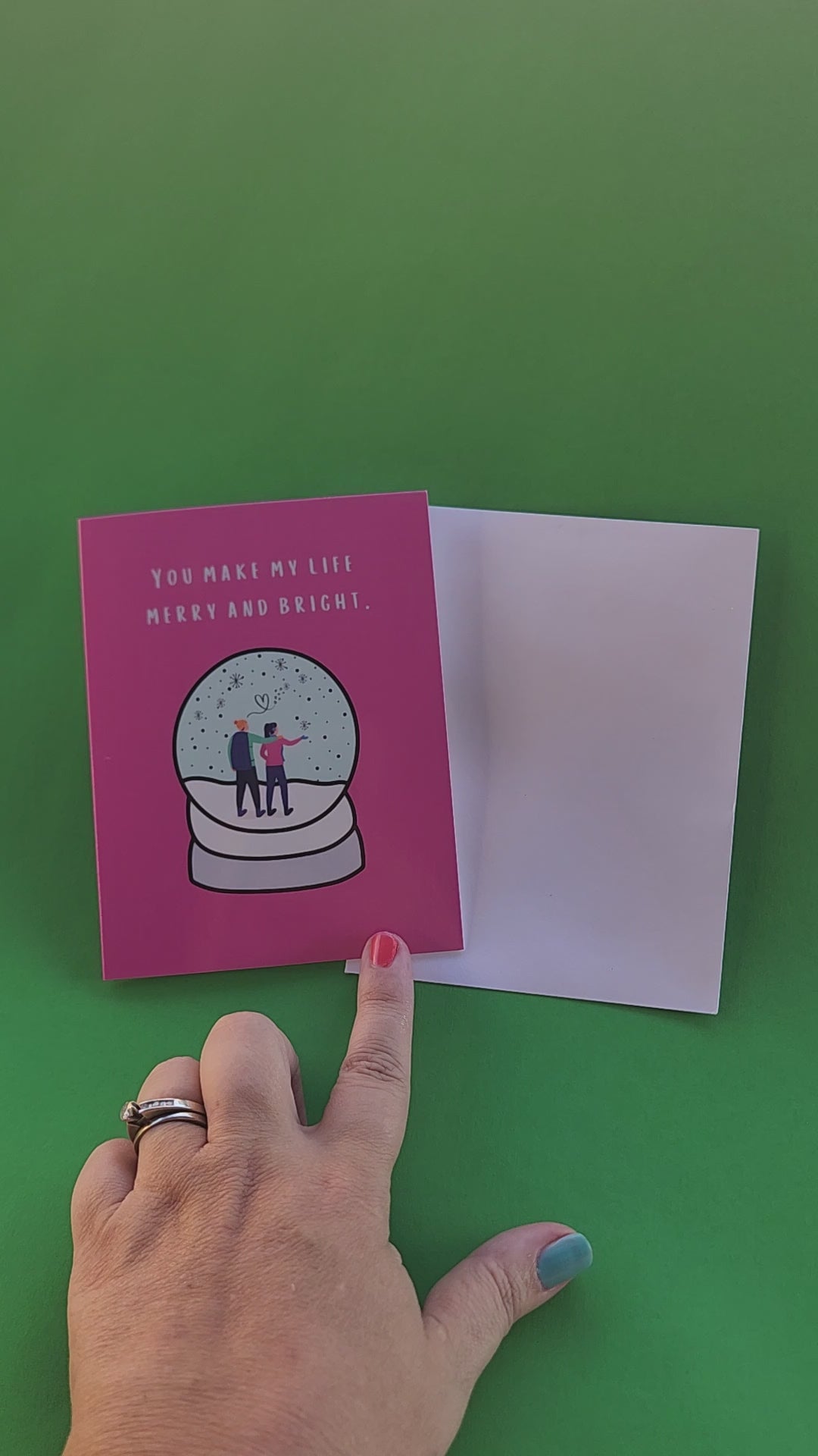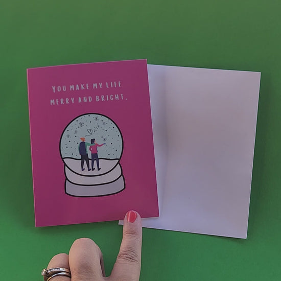 Celebrate the season with the Merry & Bright Snow Globe Christmas Greeting Card, featuring a charming couple standing inside a delicate snow globe. Set against a pink background with ice blue lettering, this card captures warmth and togetherness, whether for married partners, dating couples, or siblings. Its elegant design conveys heartfelt holiday wishes with a sophisticated touch, making it perfect for expressing joy and connection this Christmas.