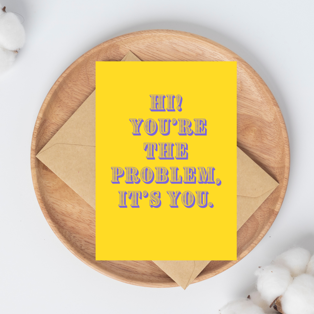 The "Hi! You're The Problem, It's You" break up greeting card features a glossy yellow finish that commands attention. With its bold and direct message, this card offers a candid way to express your feelings during a tough farewell. Its vibrant design and quality gloss make it a striking choice for delivering honesty with a touch of style and a little snark.